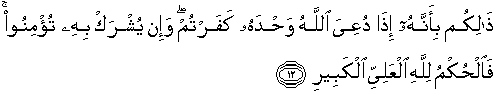12. Yang demikian itu adalah karena kamu kafir apabila Allah saja disembah. Dan kamu percaya apabila Allah dipersekutukan. Maka putusan (sekarang ini) adalah pada Allah Yang Maha Tinggi lagi Maha Besar.