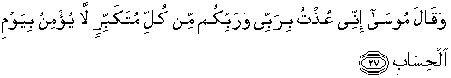 27. Dan Musa berkata: "Sesungguhnya aku berlindung kepada Tuhanku dan Tuhanmu dari setiap orang yang menyombongkan diri yang tidak beriman kepada hari berhisab."
