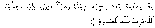 31. (Yakni) seperti keadaan kaum Nuh, 'Aad, Tsamud dan orang-orang yang datang sesudah mereka. Dan Allah tidak menghendaki berbuat kezaliman terhadap hamba-hamba-Nya.