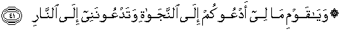 41. Hai kaumku, bagaimanakah kamu, aku menyeru kamu kepada keselamatan, tetapi kamu menyeru aku ke neraka?