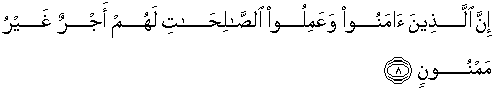 8. Sesungguhnya orang-orang yang beriman dan beramal saleh, mereka mendapat pahala yang tiada putus-putusnya."