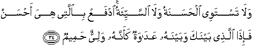 34. Dan tidaklah sama kebaikan dan kejahatan. Tolaklah (kejahatan itu) dengan cara yang lebih baik, maka tiba-tiba orang yang antaramu dan antara dia ada permusuhan seolah-olah telah menjadi teman yang sangat setia.