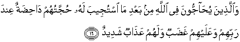 16. Dan orang-orang yang membantah (agama) Allah sesudah agama itu diterima maka bantahan mereka itu sia-sia saja, di sisi Tuhan mereka. Mereka mendapat kemurkaan (Allah) dan bagi mereka azab yang sangat keras.