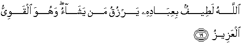 19. Allah Maha lembut terhadap hamba-hamba-Nya; Dia memberi rezki kepada yang di kehendaki-Nya dan Dialah Yang Maha Kuat lagi Maha Perkasa.