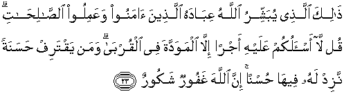 23. Itulah (karunia) yang (dengan itu) Allah menggembirakan hamba- hamba-Nya