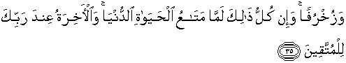 35. Dan (Kami buatkan pula) perhiasan-perhiasan (dari emas untuk mereka). Dan semuanya itu tidak lain hanyalah kesenangan kehidupan dunia, dan kehidupan akhirat itu di sisi Tuhanmu adalah bagi orang-orang yang bertakwa.