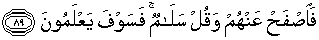 89. Maka berpalinglah (hai Muhammad) dari mereka dan katakanlah: "Salam (selamat tinggal)." Kelak mereka akan mengetahui (nasib mereka yang buruk).