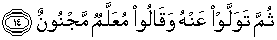 14. kemudian mereka berpaling daripadanya dan berkata: "Dia adalah seorang yang menerima ajaran (dari orang lain) lagi pula seorang yang gila