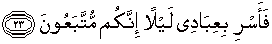 23. (Allah berfirman): "Maka berjalanlah kamu dengan membawa hamba-hamba-Ku pada malam hari, sesungguhnya kamu akan dikejar,