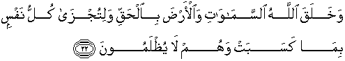 22. Dan Allah menciptakan langit dan bumi dengan tujuan yang benar dan agar dibalasi tiap-tiap diri terhadap apa yang dikerjakannya, dan mereka tidak akan dirugikan.