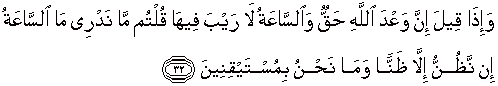 32. Dan apabila dikatakan (kepadamu): "Sesungguhnya janji Allah itu
