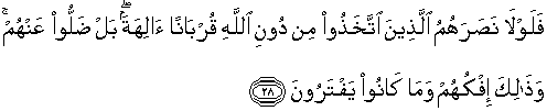 28. Maka mengapa yang mereka sembah selain Allah sebagai Tuhan untuk mendekatkan diri (kepada Allah) tidak dapat menolong mereka. Bahkan tuhan-tuhan itu telah lenyap dari mereka? Itulah akibat kebohongan mereka dan apa yang dahulu mereka ada-adakan.