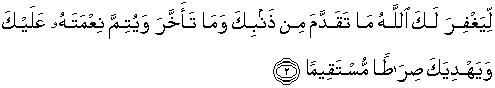 2. supaya Allah memberi ampunan kepadamu terhadap dosamu yang telah lalu dan yang akan datang serta menyempurnakan nikmat-Nya atasmu dan memimpin kamu kepada jalan yang lurus,