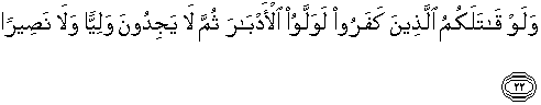22. Dan sekiranya orang-orang kafir itu memerangi kamu pastilah mereka berbalik melarikan diri ke belakang (kalah) kemudian mereka tiada memperoleh pelindung dan tidak (pula) penolong.