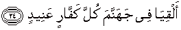 24. Allah berfirman :" Lemparkanlah olehmu berdua ke dalam neraka semua orang yang sangat ingkar dan keras kepala,