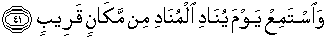 41. Dan dengarkanlah (seruan) pada hari penyeru (malaikat) menyeru dari tempat yang dekat.