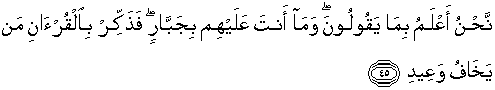 45. Kami lebih mengetahui tentang apa yang mereka katakan, dan kamu sekali- kali bukanlah seorang pemaksa terhadap mereka. Maka beri peringatanlah dengan Al Quran orang yang takut dengan ancaman-Ku.
