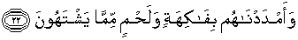 22. Dan Kami beri mereka tambahan dengan buah-buahan dan daging dari segala jenis yang mereka ingini.