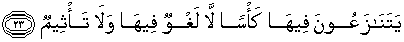 23. Di dalam surga mereka saling memperebutkan piala (gelas) yang isinya tidak (menimbulkan) kata-kata yang tidak berfaedah dan tiada pula perbuatan dosa.