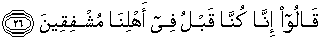 26. Mereka berkata: "Sesungguhnya kami dahulu, sewaktu berada di tengah-tengah keluarga kami merasa takut (akan diazab)."
