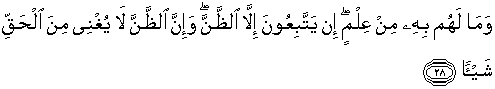28. Dan mereka tidak mempunyai sesuatu pengetahuanpun tentang itu. Mereka tidak lain hanyalah mengikuti persangkaan sedang sesungguhnya persangkaan itu tiada berfaedah sedikitpun terhadap kebenaran.