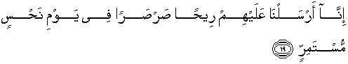 19. Sesungguhnya Kami telah menghembuskan kepada mereka angin yang sangat kencang pada hari nahas yang terus menerus,