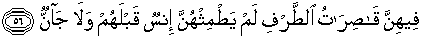 56. Di dalam syurga itu ada bidadari-bidadari yang sopan menundukkan pandangannya, tidak pernah disentuh oleh manusia sebelum mereka (penghuni-penghuni syurga yang menjadi suami mereka), dan tidak pula oleh jin.