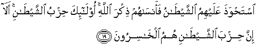 19. Syaitan telah menguasai mereka lalu menjadikan mereka lupa mengingat Allah; mereka itulah golongan syaitan. Ketahuilah, bahwa sesungguhnya golongan syaitan itulah golongan yang merugi.