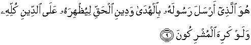 9. Dia-lah yang mengutus Rasul-Nya dengan membawa petunjuk dan agama yang benar agar Dia memenangkannya di atas segala agama-agama meskipun orang musyrik membenci.