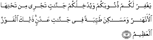 12. Niscaya Allah akan mengampuni dosa-dosamu dan memasukkanmu ke dalam jannah yang mengalir di bawahnya sungai-sungai; dan (memasukkan kamu) ke tempat tinggal yang baik di dalam jannah 'Adn. Itulah keberuntungan yang besar.