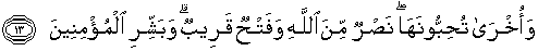 13. Dan (ada lagi) karunia yang lain yang kamu sukai (yaitu) pertolongan dari Allah dan kemenangan yang dekat (waktunya). Dan sampaikanlah berita gembira kepada orang-orang yang beriman.
