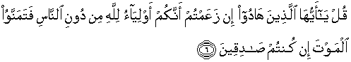 6. Katakanlah: "Hai orang-orang yang menganut agama Yahudi, jika kamu mendakwakan bahwa sesungguhnya kamu sajalah kekasih Allah bukan manusia-manusia yang lain, maka harapkanlah kematianmu, jika kamu adalah orang-orang yang benar."