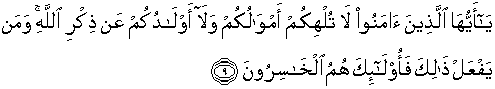 9. Hai orang-orang beriman, janganlah hartamu dan anak-anakmu melalaikan kamu dari mengingat Allah. Barangsiapa yang berbuat demikian maka mereka itulah orang-orang yang merugi.