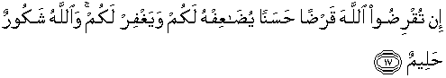 17. Jika kamu meminjamkan kepada Allah pinjaman yang baik, niscaya Allah melipat gandakan balasannya kepadamu dan mengampuni kamu. Dan Allah Maha Pembalas Jasa lagi Maha Penyantun.