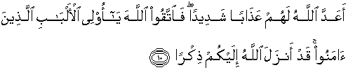 10. Allah menyediakan bagi mereka azab yang keras, maka bertakwalah kepada Allah hai orang-orang yang mempunyai akal; (yaitu) orang-orang yang beriman. Sesungguhnya Allah telah menurunkan peringatan kepadamu,