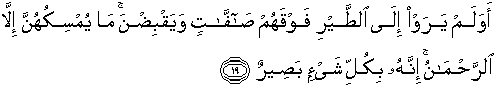 19. Dan apakah mereka tidak memperhatikan burung-burung yang mengembangkan dan mengatupkan sayapnya di atas mereka? Tidak ada yang menahannya (di udara) selain Yang Maha Pemurah. Sesungguhnya Dia Maha Melihat segala sesuatu.