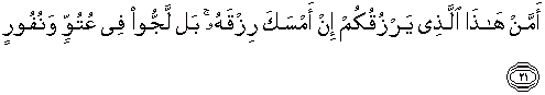 21. Atau siapakah dia yang memberi kamu rezki jika Allah menahan rezki-Nya? Sebenarnya mereka terus menerus dalam kesombongan dan menjauhkan diri?