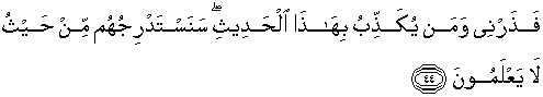 44. Maka serahkanlah (ya Muhammad) kepada-Ku (urusan) orang-orang yang mendustakan perkataan ini (Al Quran). Nanti Kami akan menarik mereka dengan berangsur-angsur (ke arah kebinasaan) dari arah yang tidak mereka ketahui,