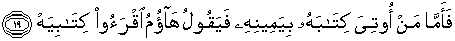 dari sebelah kanannya, maka dia berkata: "Ambillah, bacalah kitabku (ini)."