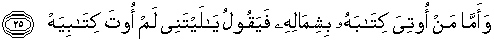 25. Adapun orang yang diberikan kepadanya kitabnya dari sebelah kirinya, maka dia berkata: "Wahai alangkah baiknya kiranya tidak diberikan kepadaku kitabku (ini).