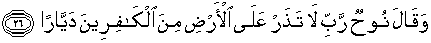 26. Nuh berkata: "Ya Tuhanku, janganlah Engkau biarkan seorangpun di antara orang-orang kafir itu tinggal di atas bumi.