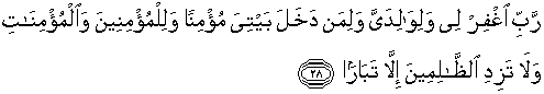 28. Ya Tuhanku! Ampunilah aku, ibu bapakku, orang yang masuk ke rumahku dengan beriman dan semua orang yang beriman laki-laki dan perempuan. Dan janganlah Engkau tambahkan bagi orang-orang yang zalim itu selain kebinasaan."