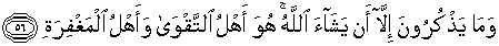 56. Dan mereka tidak akan mengambil pelajaran daripadanya kecuali (jika) Allah menghendakinya. Dia (Allah) adalah Tuhan Yang patut (kita) bertakwa kepada-Nya dan berhak memberi ampun.