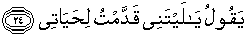 24. Dia mengatakan: "Alangkah baiknya kiranya aku dahulu mengerjakan (amal saleh) untuk hidupku ini."