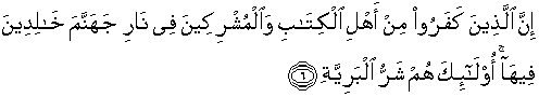 6. Sesungguhnya orang-orang yang kafir yakni ahli Kitab dan orang-orang yang musyrik (akan masuk) ke neraka Jahannam; mereka kekal di dalamnya. Mereka itu adalah seburuk-buruk makhluk.